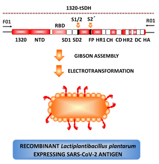 - Wang, M.; Fu, T.; Hao, J.; Li, L.; Tian, M.; Jin, N.; Ren, L.; Li, C. A recombinant Lactobacillus plantarum strain expressing the spike protein of SARS-CoV-2. Int. J. Biol. Macromol. 2020, 160, 736–740. [Google Scholar] [CrossRef]