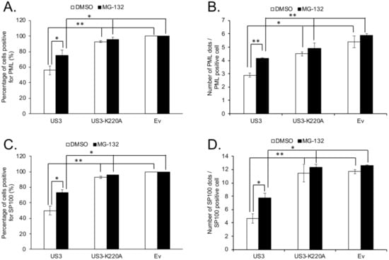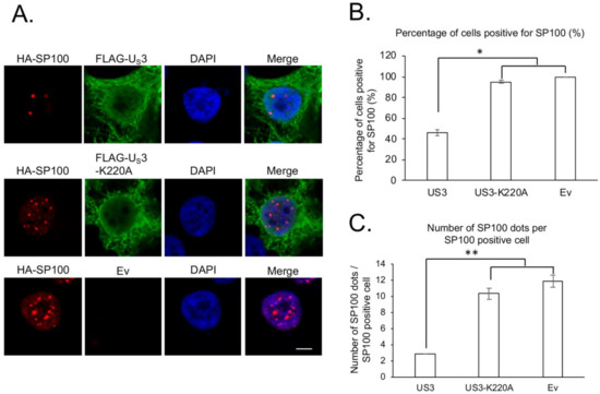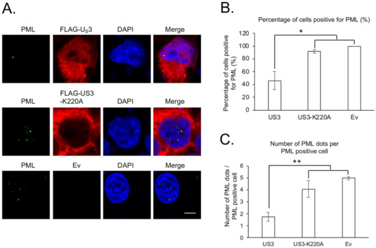 For each group, percentage of cells positive for PML or SP100, and the number of PML or SP100 dots per PML or SP100 positive cell were counted from 50 randomly selected US3 or US3-K220A positive cells using Image J software. Only cells that were positive for PML or SP100 were used to calculate the average number of PML or SP100 dots per cell.