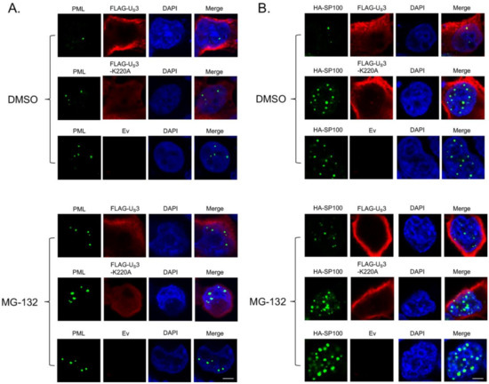 293 cells seeded on coverslips were transfected with pcDNA expression plasmids using polyethylenimine (PEI, 1 mg/mL) reagent. Forty-eight hours later, cells were fixed and permeabilized with 3.7% formaldehyde, 1.0% Triton X-100, and 1.0% NP-40, sequentially. For MG-132 and DMSO treatment, twenty-four hours after transfection, cells were treated with DMSO or MG-132 (10 µM) overnight, fixed and permeabilized, as stated above. Cells were blocked in 5% nonfat milk (in PBS) for 1 hour, followed by incubation with primary antibodies (mouse anti-PML antibody (Santa Cruz Biotechnology, #sc-377390, Dallas, TX, USA); mouse anti-HA antibody (Invitrogen, #26183, Carlsbad, CA, USA); rabbit anti-FLAG antibody (Invitrogen, #740001)) and corresponding secondary antibodies (Texas Red conjugated goat anti-rabbit antibody (Invitrogen, #T-2767); Alexa flour 488 conjugated goat anti-mouse antibody (Invitrogen, #A-11001); Texas Red conjugated goat anti-mouse antibody (Invitrogen, #T-862); Alexa flour 488 conjugated goat anti-rabbit antibody (Invitrogen, #A-11008)) for 1 h each at room temperature. Cell nuclei were stained with 4′, 6-diamidino-2-phenylindole (DAPI). Coverslips were then mounted on glass slides using ProLong Diamond Antifade Mountant, and cells were visualized using a Zeiss LSM 780 NLO multiphoton microscope.