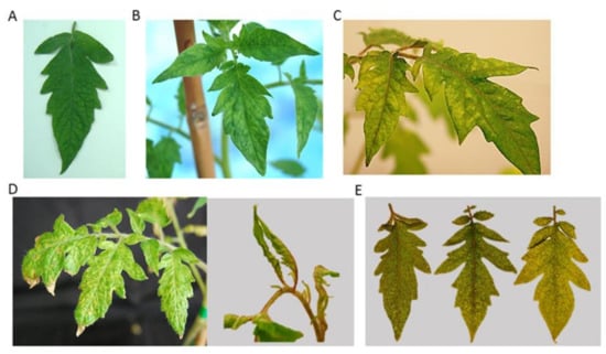 Mosaic and deformation leaf symptoms showed by tomato plants infected with Southern tomato, Pepino mosaic, and Cucumber mosaic viruses (STV, PepMV, and CMV, respectively) in single and mixed infections. Symptoms were considered as mild, moderate or severe (Panels B, C, and D, respectively). The right part of (Panel D) shows a strong leaf deformation in the plant shoots in tomato plants with severe symptoms. Panel A shows a symptomless leaf corresponding to a mock-inoculated tomato plant. (Panel E) shows three tomato leaves showing mild, moderate, or severe symptoms (from left to the right).