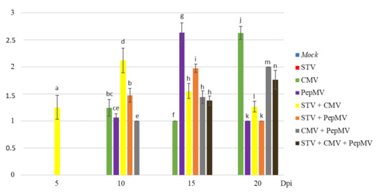 Graphic representation (mean values) of leaf symptoms severity (ordinate axis) of tomato plants infected with STV, PepMV, and CMV in single and mixed infections at 5, 10, 15, and 20 dpi (abscise axis). Leaf symptoms intensity was scored from 0 to 3, where 0 corresponds to symptomless, and 1, 2, and 3 to mild, moderate, and severe symptoms, respectively. Bars and letters up to the columns correspond to standard errors (from 0 to 0.23) and different plant groups (p-value ≤ 0.05), respectively.