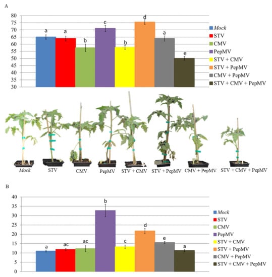 Graphical representation (mean values) of height (Panel A) and weight (Panel B) measured in cm and g, respectively, of tomato plants infected with STV, PepMV, and CMV in single and mixed infections at 20 dpi. Bars and letters up to the columns correspond to standard errors and different plant groups (p-value ≤ 0.05), respectively. At the bottom of (Panel A), we show the height of tomato plants infected with different virus combinations in comparison with mock-inoculated plants.