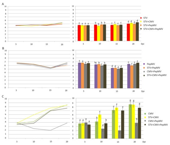 Virus accumulation (mean values) in tomato plants (ordinated axis) shown as log of concentration (no. RNA copies/ng of total RNA) of STV, PepMV, and CMV (Panel A, B, C, respectively) in single and mixed infections at 5, 10, 15, and 20 dpi (abscise axis). Bars and letters up to the columns correspond to standard errors and plant groups (in each dpi), respectively, showing differences (p-value ≤ 0.05). In each panel, virus accumulation is represented by columns (right) and in lineal representation (left).