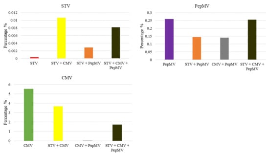 Graphic representation of the percentages (%) of vsiRNAs respect to the useful reads obtained by small RNA high throughput sequencing of the different STV, CMV, and PepMV virus combinations. The percentages of vsiRNAs were obtained from the useful reads mean values of the three biological replicates.