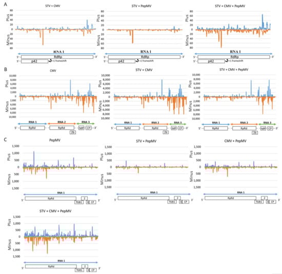 Graphical representation of plus (+) (blue) and minus (−) (orange) vsiRNAs frequencies along STV (Panel A), CMV (Panel B), and PepMV (Panel C) genomes for the different virus combinations. Virus genome organization is showed in the bottom of each graph. STV and CMV vsiRNAs frequencies were not represented, since amounts of vsiRNAs were so low in STV-single infected and CMV + PepMV double- infected tomato plants.