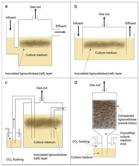 Solid substrate fermentation is a process in which microorganisms ferment a substrate in the absence of free water or with a very low free water content [77,78]. Unlike bacteria, filamentous aerobic fungi are able to grow on a substrate in the absence of free water by utilising the bound water in the substrate [79,80]. Aerobic fungi which grow on lignocellulosic substrates tend to grow in a linear rather than exponential manner [81]. Industrial applications for microorganisms such as Trichoderma and Aspergillus involve submerged culture bioreactors, but these fungi have been highly adapted and genetically modified for this purpose [82,83]. In their natural habitat, these fungi grow on solid substrates and are not submerged in culture media. Under these circumstances, and in this particular niche, the fungi require different enzymes, cellular structures and metabolites to those grown in submerged culture [84,85,86]. In recent years, there has been much interest in harnessing aerobic fungi for the purpose of solid substrate fermentation [78] and some of the adopted approaches may be applicable to the anaerobic fungi. Figure 2 presents, in schematic format, bioreactor designs that may be suitable for industrial-scale use of anaerobic fungi. While noting that the zoospores of anaerobic fungi exist in a liquid environment, their vegetative thalli grow directly on insoluble substrates and it may therefore be possible to adapt existing solid substrate fermentation methodologies to grow anaerobic fungi at industrial scale. The culture systems commonly used for solid substrate fermentation in industry are static bioreactors (fixed bed and perforated trays), agitated bioreactors (horizontal drum, continuously/intermittently pulsed) and mixing bioreactors (rotating drum) [78].