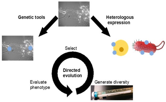 Despite the rapid pace of progress in the heterologous expression of fungal enzymes, the complex, yet biotechnologically valuable anaerobic fungal cellulosome has yet to be expressed in a model organism, although en route to synthetic fungal cellulosome construction, dockerin-fused fungal enzymes have been expressed in yeast and E. coli [90]. Many heterologous proteins sourced from anaerobic fungi struggle to achieve soluble expression in model microbes, even after careful codon optimisation. This may be due to the inability of native-like post-translational modifications in the heterologous host, activation of stress responses in the host, or both [109]. Insertion of anaerobic fungal genes in currently more genetically tractable organisms can enable the use of typical protein engineering techniques such as directed evolution and structure-aided design. The creation of large protein libraries in S. cerevisiae and E. coli, in some cases exceeding 108 variants, makes the high throughput screening of variants possible. Once an optimal variant is identified, it can be further refined and potentially retro-inserted into the original host, completing the development cycle. This methodology may be particularly relevant for anaerobic fungi, which are exceptional lignocellulosic degraders, but not highly genetically tractable, towards efficient production of biofuels.