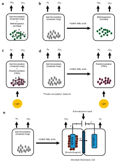 To date, the potential uses of anaerobic fungi in industrial biogas production processes has been researched and discussed in the context of converting lignocellulose into precursors for biomethane production. Combining the growth of anaerobic fungi with methanogenic organisms to ultimately produce biomethane has been reviewed in detail by Dollhofer et al. [120]. However, the use of axenic cultures of anaerobic fungi to produce biohydrogen as an alternative to the symbiotic production of biomethane from lignocellulose has not been considered. The use of biohydrogen could be advantageous over biomethane in terms of fuel efficiency. This is because hydrogen has a higher heating value (HHV) of 141.9 kJ g−1 [131]. In comparison the HHV of methane is 61% lower at 55.5 kJ g−1 [131]. At present, the global production and consumption of H2 is approximately 70 Mt year−1 [132]. The gas is almost exclusively derived from reforming of fossil fuels and production causes 830 Mt of net CO2 emissions, annually [132]. Therefore, one of the barriers to a sustainable global H2 economy is the requirement for a low-cost, green method of production such as biological generation from lignocellulosic biomass. The use of anaerobic fungi for this purpose, with their hydrogen generating hydrogenosomes and unrivalled ability to deconstruct lignocellulosic substrates, merits detailed scientific exploration. Previously, the anaerobic production of H2 by bacteria or algae in the absence of light has been collectively referred to as “dark fermentation” [133,134]. Herein, and for the first time, the term dark fermentation is used while discussing the potential for industrial fermentative biohydrogen production by anaerobic fungi.