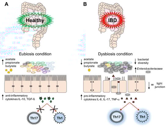 A schematic representation of eubiosis (A) and dysbiosis (B) conditions. (A) Microbiota plays an important role in the maintenance of gut stability by: (i) producing short-chain fatty acids (SCFAs) (i.e., acetate, propionate, and butyrate), (ii) preventing the expansion in any microbial pathogens, and (iii) modulating the immune system (i.e., production of anti-inflammatory cytokines (Interleukin (IL)-10, Transforming Growth Factor (TGF)-β)) and decreasing the activation of T-helper cell (Th)17 and Th1 cells; (B) During dysbiotic conditions, bacteria belonging to the Enterobacteriaceae family could overgrow, leading to a decrease in bacterial diversity and in gut stability. This is reflected by a decrease in SCFA production, and a parallel increase in pro-inflammatory cytokines such as IL-6, IL-17, and tumor necrosis factor (TNF)-α, which activate Th17 and Th1 cells involved in the inflammation response. Moreover, a decrease in tight junctions and a subsequent loss of impermeability in the intestinal epithelium is observed.