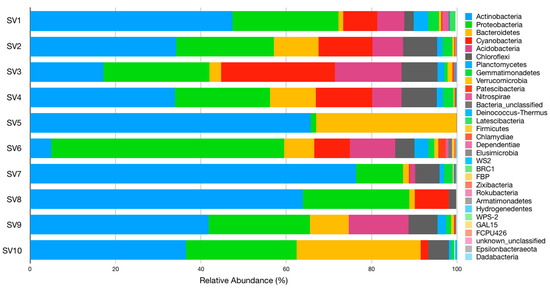 From the twenty-nine phyla identified, six were highly abundant, comprising at least 89% of the sequences in each sample. These were Actinobacteria, Proteobacteria, Bacteroidetes, and Cyanobacteria (all were found in all samples), Acidobacteria (all but SV5 and SV10), and Chloroflexi (all but SV5). Phyla Gemmatimonadetes and Planctomycetes were also identified in all samples except SV5; however, their distribution (relative abundance) was quite different between samples (Figure 1).