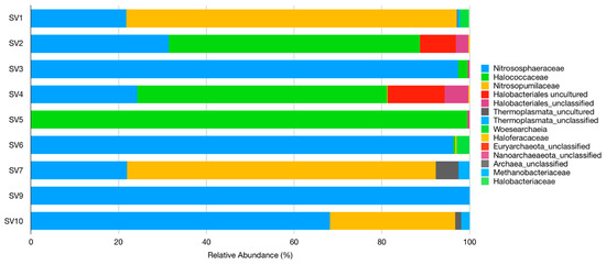 Nitrosophaeraceae was the most abundant family and was dominant in SV3, SV6, SV9, and SV10, essentially represented by ‘Candidatus Nitrocosmicus’. Nitrosopumilaceae was the dominant family in SV1 and SV7, and it was almost exclusively represented by ‘Candidatus Nitrosotenuis’. Halococcaceae was the dominant family in SV2, SV4, and SV5, and it was mostly composed of genera Hallococcus and Halalkalicoccus (especially in SV4).