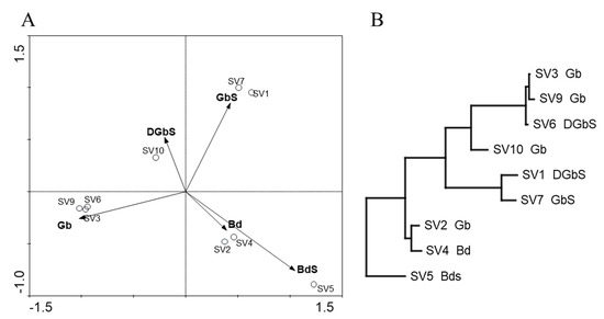 For domain Bacteria, a direct correlation between specific population profiles (from each sample) and biodeterioration patterns was not verified consistently. Except for samples SV1, SV7, and SV5 that were distant from the remaining samples, all others were clustered together, regardless of the degradation pattern where they were collected from. Samples SV1 and SV7 were collected in different chapels but clustered together in the PCA and Euclidean similarity dendrogram, indicating a similar composition and distribution. Sample SV5 represented the only sample classified as “black discoloration with salt efflorescence”, and was plotted separately from all others, given its exclusive species composition. Despite the remaining samples (SV2, SV3, SV4, SV6, SV8, SV9, and SV10) being clustered together, it was not possible to establish a core microbiome by comparing their bacterial OTU profiles in mothur (data not shown).