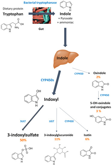 Metabolites of indole excreted in urine. Indole is produced from dietary tryptophan by the gut microbiota tryptophanase [9]. Then, indole is absorbed and metabolized in the liver by different cytochrome P450 isozymes (CYP450s), arylsulfotransferases (SULT), and UDP-glucuronosyltransferases (UGT) [12,13,14]. Experiments in which an oral bolus of [2-14C] indole was given to rats showed that 80% of the radioactivity was excreted in urine. 3-Indoxylsulfate was the major metabolite (50% of the ingested dose). Other minor metabolites, namely 3-indoxylglucuronide, isatin, oxindole, and 5-OH-oxindole and conjugates were identified and accounted for 11, 6, 3, and 2% of the ingested dose, respectively [15].