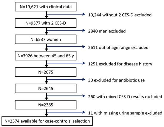 Depressive episodes are twice as common in women as in men and increase with age [20]. Therefore, to reduce statistical heterogeneity due to age and gender, we selected 3926 women aged 45 to 65 years at clinical examination, who had filled out the CES-D questionnaire twice at 26 and 53 months after inclusion, and for whom biological samples and at least three dietary records were available. The following criteria were also taken into account: no declaration of history (prevalent or incident) of gastrointestinal disease (hepatitis, Crohn disease, haemorrhagic rectocolitis, gluten intolerance, colopathy or irritable bowel syndrome), cancer, myocardial infarction, rheumatoid arthritis, sarcoidosis, multiple sclerosis, lupus erythematosus or ankylosing spondylitis; no antibiotic use at the time of biological sampling. After applying these exclusion criteria, there were 2374 participants available for case-control selection (Figure 2).