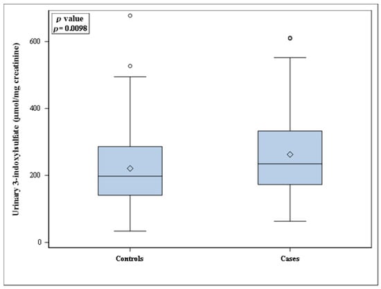 Box plot of urinary 3-indoxylsulfate concentrations (expressed as µmol/mg creatinine) in controls (n = 174) and cases (n = 87). Open diamonds inside the boxes are means; open circles outside the boxes are outliers.