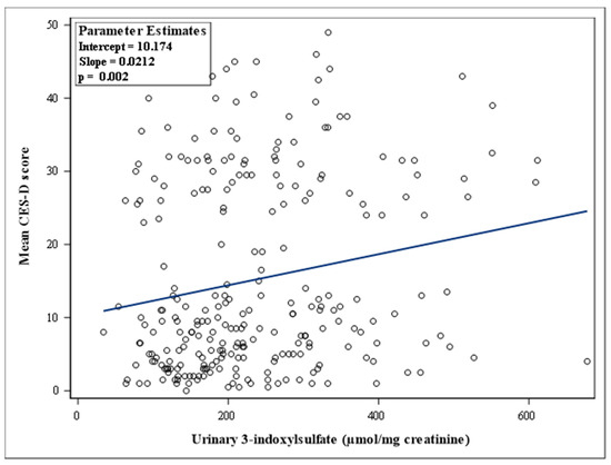Scatter plot of the mean values of the two CES-D scores per individual (n = 261) versus urinary 3-indoxylsulfate concentrations (expressed as µ mol/mg creatinine).