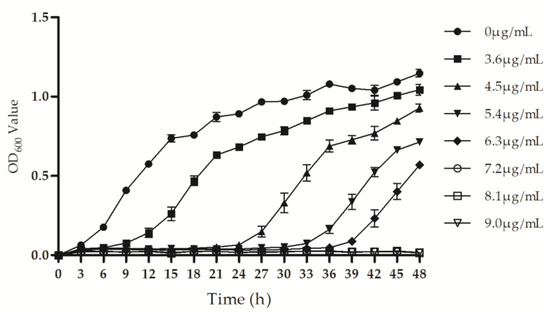 The 48 h growth curve of Psa treated with different concentrations of ethylicin.