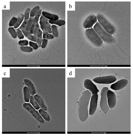 TEM images of Psa after incubation with different concentrations of ethylicin: (a) 0 μg/mL; (b) 1.80 μg/mL; (c) 3.60 μg/mL; and (d) 5.40 μg/mL ethylicin. The scale bars for (a–d) are 1 μm.