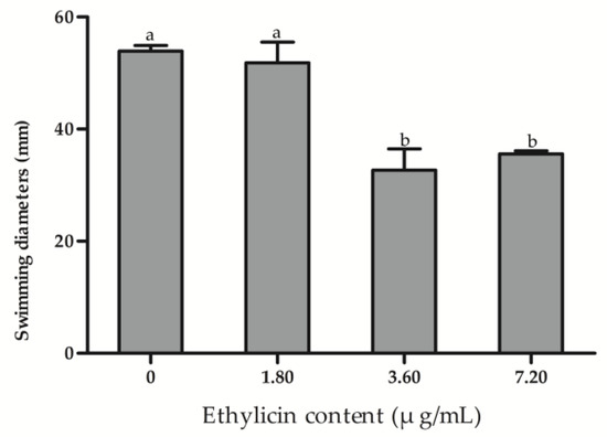 To investigate the effect of ethylicin on bacterial motility, the swimming diameter of Psa is measured in the presence and absence of ethylicin. It can be seen in the figure that the diameter of the colonies is reduced by about 40% in the plates with 3.60 μg/mL of ethylicin, indicating that ethylicin significantly inhibited the motility of Psa (Figure 6).
