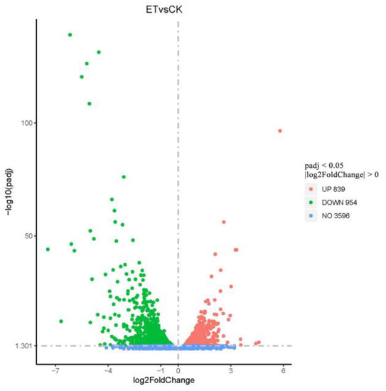 A total of 5389 differential genes were identified by transcriptome sequencing, using padj < 0.05, log2FoldChange > 0 as the standard. There were a total of 1793 genes with significant differences between the CK group and the ethylicn (ET) group, of which 954 differential genes were down-regulated and 839 genes were up-regulated (Figure 7 and Table S3).