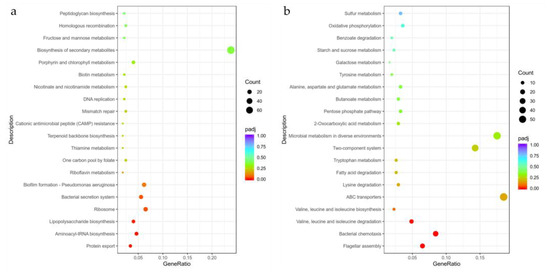KEGG is a comprehensive database that integrates genomic, chemical, and system function information. The KEGG pathway analysis enriched 631 differential genes to 80 pathways (Table S5), the 20 most significant KEGG pathways were selected for scatter plotting (Figure 9), and the gene changes of the top 10 most significant pathways were counted (Figure S7). The most significantly up-regulated pathway is protein export, with 11 genes up-regulated and no genes down-regulated, suggesting that ethylicin may accelerate protein secretion by Psa. The most significantly down-regulated pathway is flagellar assembly, with 20 genes down-regulated and 2 genes up-regulated, suggesting that ethylicin treatment may inhibit the flagellar assembly process of Psa, which in turn inhibits the formation and motility of Psa flagella. In particular, the pathway with significant up-regulation is also biofilm formation–Pseudomonas aeruginosa, with a total of 29 differential genes enriched, of which 20 are up-regulated and 9 are down-regulated. It is suggested that ethylicin may promote the up-regulated expression of genes associated with biofilm formation, which in turn promotes biofilm formation in Psa.