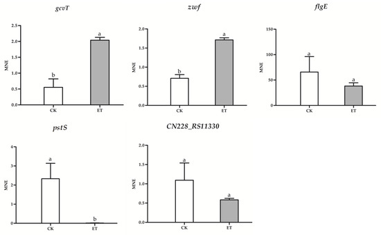 The qRT-PCR results. The data represent the means ± SD of three replicate samples (ET represent the average treatment of ethylicin at 3.6 μg/mL). Different letters (a, b) indicate significant differences at p < 0.05.