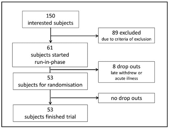 Flowchart visualizing recruitment of participants. Of 150 interested subjects, 61 were eligible for study inclusion and started a one-week run-in phase with a balanced mixed (omnivorous) diet according to the recommendations of the German Nutrition Association. Eight of these participants suffered from acute illness or withdrew from participation during the run-in phase and were not randomized. Fifty-three participants were randomized to VD or MD and started the trial. All randomized participants finished the trial as per protocol.