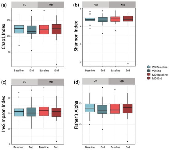 Comparing alpha diversity for VD and MD at baseline and end of intervention. (a) Chao1: Bacterial composition of samples based on the number of observed taxa. For both diets, the Chao1 index did not change after the trial (pVD = 0.770, pMD = 0.629). (b) Shannon index: By abundance weighted bacterial composition of samples, reflecting both richness and bacterial evenness within a sample. For both diets, the Shannon index did not change after the trial (pVD = 0.921, pMD = 1.000). (c) Inverse Simpson index: Species richness based on relative abundance. For both diets, the Inverse Simpson index did not change after the trial (pVD = 0.921, pMD = 0.861). (d) Fisher’s index: quantifying the relationship between number and abundance of species. For both diets, the Fisher’s index did not change after the trial (pVD = 0.822, pMD = 0.600).