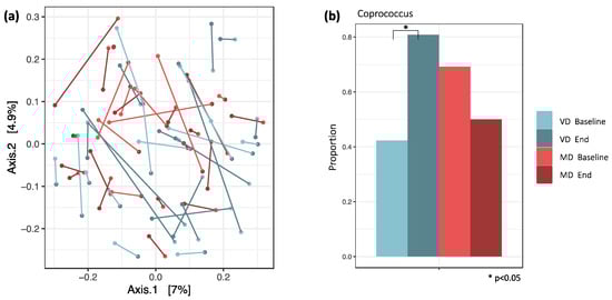 (a) PCoA plot with Bray–Curtis distances. Similarity of samples based on the weighted abundance of shared taxa. The connections between baseline and end samples indicate that both samples from one individual are very similar. (b) For VD and MD, the proportions of samples in which Coprococcus was detected are plotted. It was the only genus with a significant change in proportions between baseline and end samples in VD. Here, the proportion increased from 42% to 81% (padj = 0.047), while in MD, it decreased from 69% to 50% (padj = 0.672).