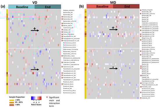 (a) Log-transformed and standardized abundances for all ASVs with significant main effects in VD; “_NA” describes unspecified species. Upregulated ASVs are shown in the top panel while downregulated ASVs are displayed in the bottom panel. The asterisk marks all ASVs which also have a significant interaction term, i.e., ASVs with a significantly different change in VD compared to their respective change in MD. (b) Corresponding plot for MD.