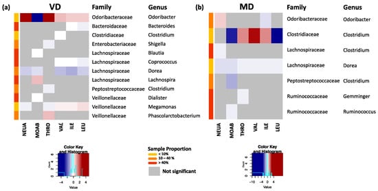 Previous analyses of our research group showed a strong correlation of neutrophilic granulocytes, monocytes, and thrombocytes with serum concentration of branched-chain amino acids (valin, leucine, and isoleucine) in VD []. Therefore, we analyzed the associations of these parameters with the changes in the gut microbiota in VD and MD by applying ZINB with each clinical parameter separately as a predictor. Within the significant results (padj < 0.05) (Tables S3–S4), we found in VD for all clinical markers strong associations with the rare genus Odoribacter, abundant in less than 10% of all samples (Figure 5a), and in MD with the rare genus Clostridium (Figure 5b). Interestingly, in VD, all branched-chain amino acids (VAL, ILE, LEU) were negatively associated with Coprococcus and Dorea and correlated positively with Megamonas. A negative association of branched-chain amino acids with Dorea was also found in MD (Figure 5b).