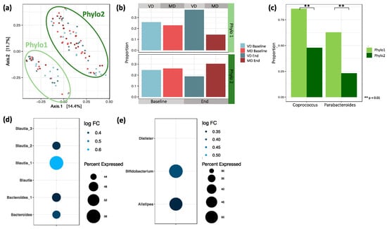 Analyzing the sample composition within Phylo1 and Phylo2, we found that while baseline samples from VD and MD were almost evenly distributed within each of the two groups, there was a slight, but non-significant, shift in sample composition after the trial (Figure 6b, p = 0.130). While, in Phylo1, end samples from VD were overrepresented, in Phylo2, the shift was towards the MD end samples.