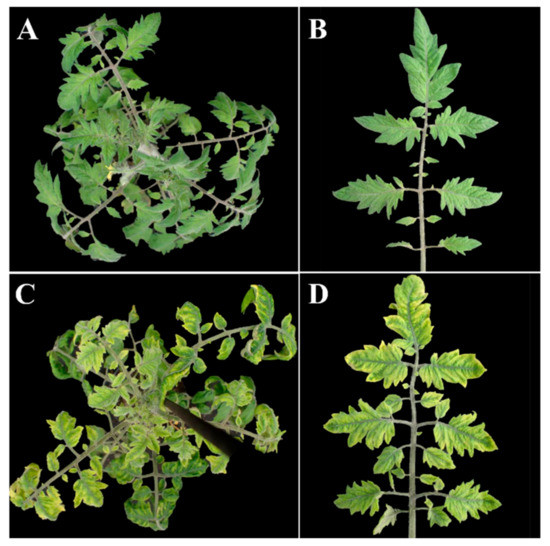 Typical symptoms associated with tomato yellow leaf curl disease. (A,B) Uninfected tomato plant of cv. Moneymaker. (C,D) Tomato plant infected with tomato yellow leaf curl virus (TYLCV). Photos were taken 37 days post inoculation using Agrobacterium-mediated inoculation of the infectious clone of TYLCV-Israel strain (TYLCV-IL).