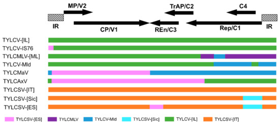 Diagram representing the recombination map of TYLCV complex. Blocks with same color shading represent regions of high identity. The positions of open reading frames (horizontal arrows, CP/V1, MP/V2, Rep/C1, TrAP/C2, Ren/C3, C4) and intergenic regions (IR) are represented on the top of the graph. Tomato yellow leaf curl (TYLC) virus-Israel (TYLCV-[IL]), TYLC Mali virus—Mali (TYLCMLV-[ML]), TYLC virus—Mild [Israel] (TYLCV-Mld [IL]), TYLC Malaga virus-Spain (TYLCMaV-[ES]), TYLC Axarquia virus- Spain (TYLCAxV-[ES]), TYLC Sardinia virus—Italy (TYLCSV-[IT]), TYLC Sardinia virus—Sicily (TYLCSV-[Sic]), TYLC Sardinia virus—Spain (TYLCSV-[ES]).