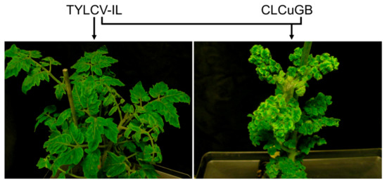 Usually the resulting new disease complexes are characterized by more severe symptoms consisting of extremely stunted and distorted plants (Figure 4) [33,55]. In N. benthamiana, co-replication of TYLCV with ageratum yellow vein betasatellite (AYVB) increases the symptom severity level [56,57]. Co-infection of TYLCMLV and cotton leaf curl Gezira betallatellite (CLCuGB) by cross-feeding of whiteflies resulted in more severe symptoms [33,54]. In the presence of honeysuckle yellow vein mosaic betasatellite (HYVMVB), TYLCV-infected tomato plants developed more severe stunting symptoms [55]. A recent study showed that co-replication of TYLCV-IL with CLCuGB leads to a significant increase of TYLCV symptoms (Figure 4) [58].