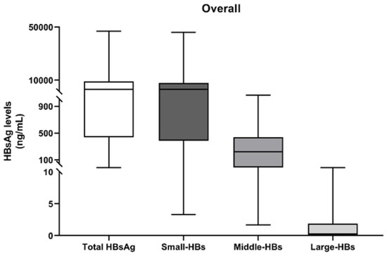 The hepatitis B surface antigen (HBsAg) consists of three different proteins encoded within the same S open reading frame (ORF S) by the alternate usage of translational start codons—(i) large HBsAg (L-HBs), consisting of preS-1, preS-2 and S regions; (ii) middle HBsAg (M-HBs) consisting of pre-2 and S regions and a small HBsAg, containing only an S region [17,18]. Thus, all the three HBs proteins share the same C-terminal S region, that represent the targets of the commercially available serological assays routinely used for HBsAg quantification. Consequently, these commercial assays permit quantification of only the overall amount of the three HBs forms, while they cannot distinguish the different contribution of the three HBs isoforms [19].