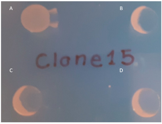 Spot test results confirming the restoration of susceptibility to φBO1E infection observed in BO-FR-1(pACYC-wbaP). Strains are as follows: BO-FR-1 (A), KKBO-1 (B), BO-FR-1(pACYC-wbaP) (C) and (D). Ten μL of cells in suspension of each strain were spotted on a LBA plate and partially layered with 5 μL of φBO1E (7 × 107 PFU/mL).