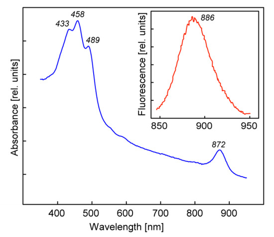 In vivo absorption spectra of Sphingomonas sp. AAP5 cells. (Inset) The fluorescence emission spectrum.