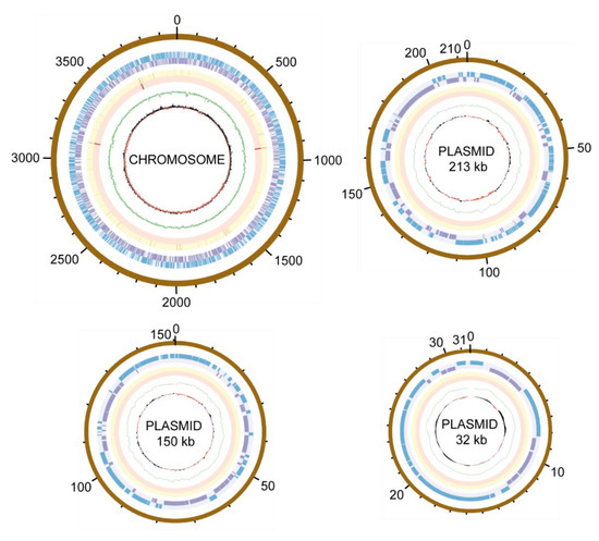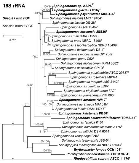Phylogenomy and genomic traits. AAP5 genome contains three copies of the 16S rRNA gene. Two copies are identical (at position 3117387..3118878 and 3704698..3706189), the third one (at position 905790..907281) differs in one nucleotide position. For the alignment we used sequence from the two identical copies. The 16S rRNA tree (Figure 3) showed that AAP5 strain grouped with the genus Sphingomonas and formed a distinct cluster with S. glacialis (98.3% pairwise 16S rRNA sequence similarity), S. psychrolutea (96.8%), and S. melonis (96.5%). Further evidence provided in silico comparison of genomic sequences of strain AAP5 and reference strains of three species, S. glacialis C16yT, S. psychrolutea MDB1-AT, and the type species of the genus S. paucimobilis NCTC 11030T. In silico DNA-DNA hybridization values between strain AAP5 and S. glacialis C16yT, between strain AAP5 and S. psychrolutea MDB1-AT, and between strain AAP5 and S. paucimobilis NCTC 11030T were 74.50 ± 2.95%, 23.60 ± 2.4%, and 20.0 ± 2.3%, respectively. The cut-off value for species delineation is 70%. Average nucleotide identity values, representing mean identity values between a given pair of genomes, were 97.09% between strain AAP5 and S. glacialis C16yT, 80.35% between strain AAP5 and S. psychrolutea MDB1-AT, and 74.26% between strain AAP5 and S. paucimobilis NCTC 11030T. The proposed boundary for defining a novel species is 95–96% [50]. In addition, we calculated the numbers of shared orthologous gene clusters among strain AAP5 and the two reference strains. Strain AAP5 shares 2,174 orthologous gene clusters with the type strain of S. pauci-mobilis NCTC 11030T. The number of unique orthologous gene clusters (620) shared by AAP5 and S. glacialis C16yT was much greater than the number shared by either AAP5 and S. psychrolutea MDB1-AT (44) or AAP5 and S. paucimobilis NCTC 11030T (85), indicating a close relationship between AAP5 and S. glacialis C16yT also at the genomic level. In summary, phylogenetic and genomic analyses imply that AAP5 belongs to the same genus as the three reference Sphingomonas strains with S. glacialis C16yT representing its closest relative. The genome of AAP5 consists of four replicons (Figure 4) including one circular chromosome (3,987,367 bp; GC content 66.2%), and three plasmids p32 (31,551 bp; GC content 63.3%), p150 (150,273 bp; GC content 63.3%), and p213 (213,080 bp; GC content 62.7%) with a total length of 4,382,271 bp encoding 4,128 genes. Overall, GC content is 65.9%. Similar GC content of all four replicons suggests their common origin. The chromosome contains three copies of rRNA operons (5S, 16S, 23S), 51 tRNA genes, and 4,065 protein-coding sequences. It is notable that the AAP5 chromosome contains one continuous 38.6-kb-long photosynthesis gene cluster (E2E30_16220–E2E30_16405) and a gene coding for xanthorhodopsin (E2E30_05030), a transmembrane protein with (presumably) proton-pumping activity [22]. Furthermore, AAP5 contains a complete and contiguous gene cluster (E2E30_17610–E2E30_17700) with genes coding for gene transfer agents (GTA), virus-like particles transferring pieces of genomic DNA between prokaryotic cells. The gene organization is similar to the GTA cluster in Rhodobacter capsulatus [51]. The pufL and pufM genes, coding proteins of the type 2 reaction centers, represent standard genetic markers of anoxygenic phototrophs and were used to infer the phylogenetic relationship of strain AAP5 with other phototrophic Proteobacteria. The ML phylogenetic tree shows a split between basic alphaproteobacterial orders (Rhodobacterales, Sphingomonadales, Rhizobiales) (Figure 5). The AAP5 strain clearly clusters with other photosynthetic Sphingomonas. Similarly, as in the 16S rRNA tree, Sphingomonas glacialis C16yT represents its closest relative. Interestingly, inside of the Sphingomonadales branch lays also one species from a distinct order, Polynucleobacter duraquae DSM 21495T (Burkholderiales) (Figure 5). The presented tree agrees well with recently published PufLM phylogeny of phototrophic Proteobacteria [52,53].