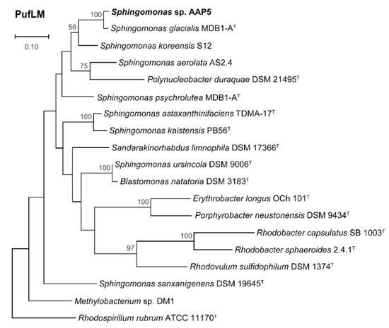 - Kim, M.K.; Schubert, K.; Im, W.T.; Kim, K.H.; Lee, S.T.; Overmann, J.; Affiliations, V. Sphingomonas kaistensis sp. nov., a novel alphaproteobacterium containing pufLM genes. Int. J. Syst. Evol. Microbiol. 2007, 57, 1527–1534. [Google Scholar] [CrossRef]