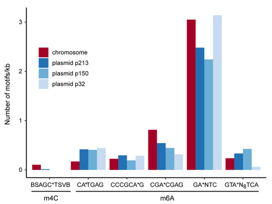 DNA methylation. Single-molecule real-time sequencing allows for detection of any DNA modifications [54]. Three different methylation sites are commonly found in bacteria [55]. We identified 19502 N6-Adenosine (m6A) and 420 N4-Cytosine (m4C) bases but no N5-Cytosine (m5C) motifs on the chromosome and plasmids of AAP5 (Figure 6). The only present m4C-motif was restricted to the chromosome and plasmid p213, whereas the five m6A motifs were found on all four replicons. By far, the most abundant was the GANTC motif that is m6A-methylated by the methyltransferase CcrM [56]. This enzyme is highly conserved in Alphaproteobacteria. The GANTC motif is overrepresented in intergenic regions and underrepresented in genes [57]. In Caulobacter vibrioides CcrM-activity is restricted to the pre-divisional cell, thus newly replicated DNA stays hemimethylated until replication has finished. The activity of several Caulobacter vibrioides promoters is dependent on the methylation state and, thereby, coupled to replication [58,59]. The density of GANTC-motifs is similar for the chromosome and plasmid p32 but lower for the plasmids p213 and p150. The other five m6A-motifs as well as the m4C motif might represent targets for restriction-modification systems [60]. The motif CATGAG is underrepresented on the chromosome compared to the plasmids and might, therefore, have a regulatory function for extrachromosomal elements.