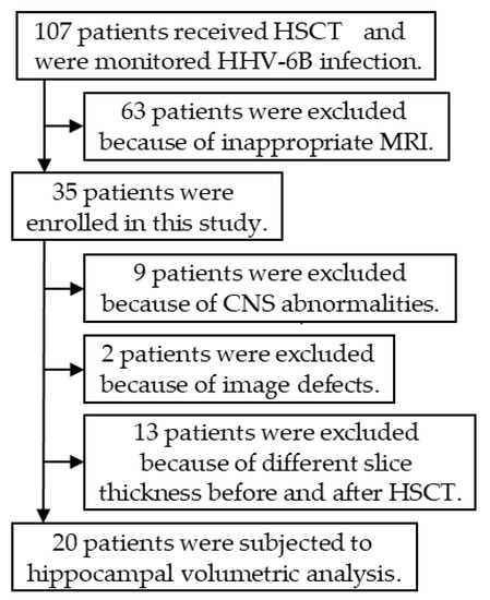 Between July 2008 and April 2014, 107 patients received HSCT at Nagoya University Hospital. They were monitored weekly for HHV-6B infection with viral isolation and real-time PCR. Among these patients, 63 were excluded because of missing pre- or post-transplant brain MRI. An additional nine patients were excluded because they had CNS disorders such as brain tumors. Thus, 35 of the 107 HSCT recipients were monitored for HHV-6B infection and underwent brain MRI before and after transplantation. However, 15 patients were excluded due to inadequate brain MR images (unclear image, two patients; different slice thickness before and after transplantation, 13 patients). Ultimately, 20 patients were enrolled in the volumetric analysis (Figure 1). Clinical information was collected retrospectively from medical records.