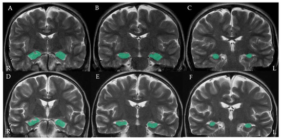 A coronal T2-weighted image of the brain for patient 1. The three hippocampal segments (head, body, and tail) before transplantation (A–C) and after transplantation (D–F) are shown in green.