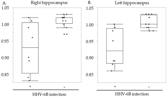 The hippocampal volume ratio before and after transplantation. (A) Right hippocampus; (B) Left hippocampus. The vertical axes indicate the hippocampal ratio of the hippocampal volume from before to after hematopoietic stem cell transplantation recipients with (+) and without (−) human herpesvirus 6B (HHV-6B) infection.