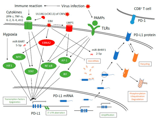 Schematic diagram of regulation of programmed cell death ligand 1 (PD-L1) gene expression. Green color indicates positive regulators, while orange denotes negative regulators. Red color indicates viral factors. IFN-γ, interferon-γ; TNF-α, tumor necrosis factor-α; IL-2, interleukin-2, CMV, cytomegalovirus; UL146, unique long 146; vCXCL1, viral chemokine (C-X-C motif) ligand 1; EBV, Epstein–Barr virus; LMP1, latent membrane protein 1; PAMPs, pathogen-associated molecular patterns; TLRs, toll-like receptors; HIF1, hypoxia-inducible factor 1; MYC, myelocytomatosis oncogene; STAT, signal transducer and activator of transcription; NF-κB, nuclear factor-κB; AP-1, activator protein 1; IRF, interferon regulatory factor, miR-BHRF1-2-5p, microRNA-BamHI H fragment rightward frame 1-2-5p.