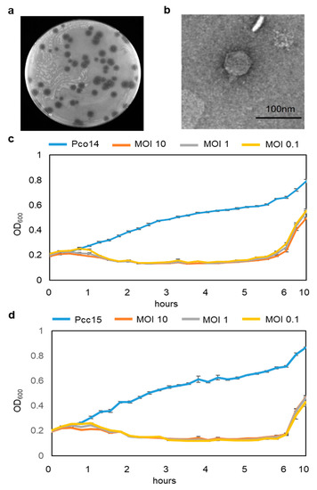 - Lim, J.-A.; Lee, N.H.; Heu, S. Isolation and Genomic Characterization of the T4-Like Bacteriophage PM2 Infecting Pectobacterium carotovorum subsp. carotovorum. Plant Pathol. J. 2015, 31, 83–89. [Google Scholar] [CrossRef][Green Version]