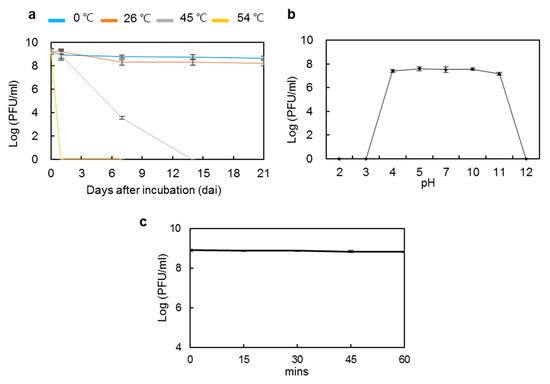 3.4. Stability of phiPccP-1 under Diverse Temperature, pH, and UV Irradiation
