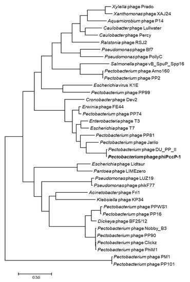 - Lim, J.-A.; Heu, S.; Park, J.; Roh, E. Genomic characterization of bacteriophage vB_PcaP_PP2 infecting Pectobacterium carotovorum subsp. carotovorum, a new member of a proposed genus in the subfamily Autographivirinae. Arch. Virol. 2017, 162, 2441–2444. [Google Scholar] [CrossRef]