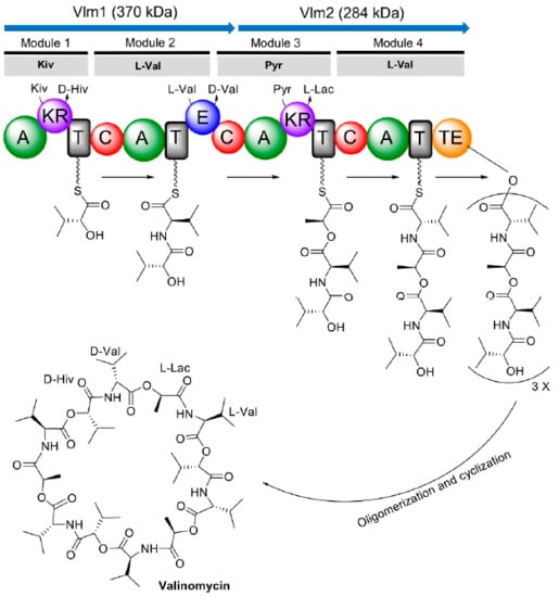 Until 2014, Jaitzig and colleagues provided the first experimental proof for the previous proposed model of valinomycin synthetase [93]. The authors purified Vlm1 and Vlm2 from a heterologous expression host E. coli and performed an in vitro enzymatic activity assay towards possible substrates. The results indicated that both Vlm1 and Vlm2 activated l-Val, which has been demonstrated as a substrate for valinomycin biosynthesis in the early studies. By contrast, the activation of d-Val was not observed. Importantly, two keto acids Kiv and Pyr were selectively activated by Vlm1 and Vlm2, respectively. However, other tested hydroxyl acids l/d-Hiv and l/d-Lac were not activated by both NRPSs. Therefore, the direct substrates of valinomycin were concluded to be l-Val, Pyr, and Kiv. This also confirmed the correctness of the proposed valinomycin synthetase model by Magarvey et al. [92]. As shown in Figure 3, module 1 activates Kiv, which is subsequently reduced to d-Hiv by a dedicated KR domain; l-Val is activated by module 2 and an E domain in this module converts l-Val to d-Val; another KR domain in module 3 reduces activated Pyr to l-Lac; and the fourth module activates l-Val. Collectively, the four modules of valinomycin synthetase are iteratively reused to assemble three tetradepsipeptide basic units of d-α-hydroxyisovaleryl-d-valyl-l-lactyl-l-valyl, which are finally oligomerized and macrolactonized by a C-terminal TE domain to form the 36-membered cyclododecadepsipeptide valinomycin. Recently, the structure of the TE domain was solved and the mechanism how TE oligomerizes and cyclizes a linear full-length dodecadepsipeptidyl intermediate was elucidated [94]. However, the structure of the whole NRPS valinomycin synthetase (Vlm1 and Vlm2) has not been reported up to now.
