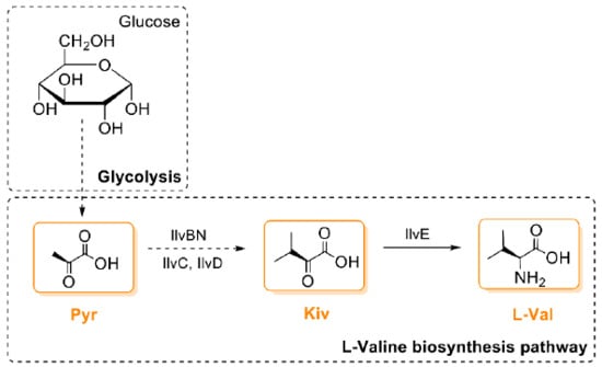 Currently, more than 20 Streptomyces strains have been reported to produce valinomycin, albeit their productivities are very different as summarized in Table 2. Production of valinomycin using native producers is still limited because, for example, the cultivation of Streptomyces microorganisms is time-consuming (several days) and the genetic manipulation of Streptomyces is complex and laborious. Only a few studies optimized different conditions for enhanced production of valinomycin using native Streptomyces strains. An orchard soil isolated strain Streptomyces sp. M10 was capable of synthesizing valinomycin yet with a relative low yield (about 3.83 mg/L) [48]. A later study discovered that, in addition to valinomycin, this M10 strain also produced bafilomycin (Figure S2), which shares a common precursor (α-ketoisovaleric acid, Kiv) with valinomycin [101]. By disrupting the bafilomycin biosynthetic genes, the yield of valinomycin was increased up to 6 mg/L, which is 1.5-fold higher than the productivity of the parental strain. Further disruption of the branched-chain α-keto acid dehydrogenase (BCDH) gene clusters, encoding a BCDH enzyme complex that can convert Kiv to isobutyric acid, valinomycin production in the mutant was enhanced to 16 mg/L. Another optimization process was performed with a psychrotrophic strain Streptomyces lavendulae ACR-DA1, isolated from the soil of a high altitude cold desert [96]. Production of valinomycin was optimized for different fermentation conditions like medium, temperature, and addition of precursors. Finally, the maximum yield of valinomycin (84 mg/L) was obtained with a synthetic mineral base starch (MBS) medium and precursor addition (l-valine) at a low temperature of 10 °C for a period of eight-day cultivation in shake flasks. However, the yield was reduced to 19.4 mg/L when the fermentation was scaled up to a 5 L bioreactor level [102].